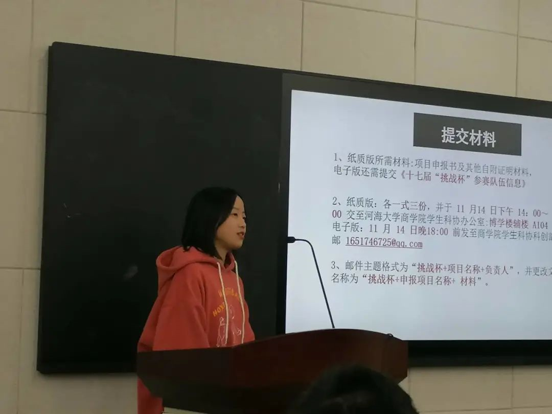 随后九色 学生科协的郑佳慧同学针对大赛要求和本次九色 院内赛流程进行了讲解,向同学们介绍了项目申报注意事项、作品类别、参赛要求和面向对象等。
