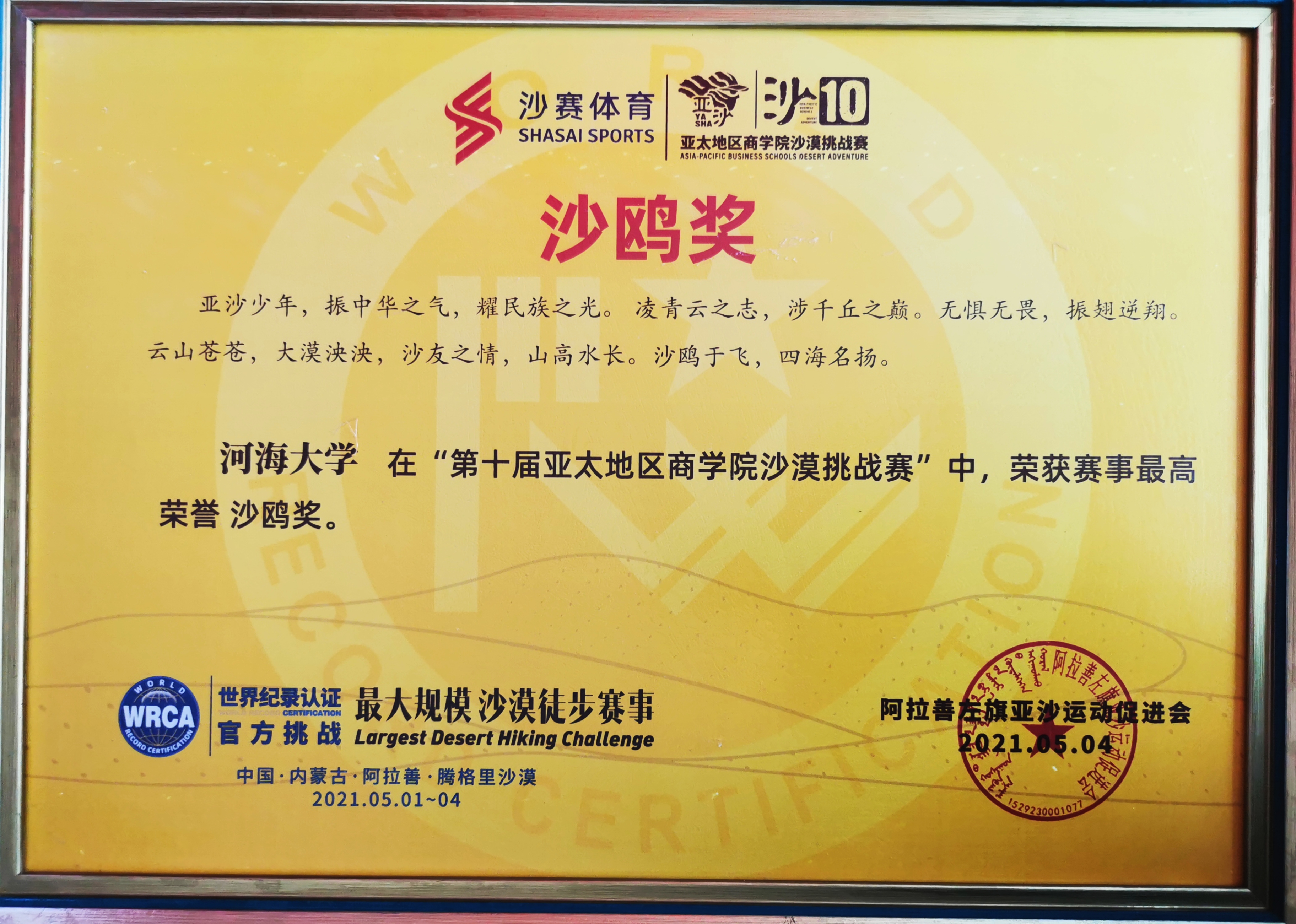 2021年5月2日至4日,第十届亚太地区九色 沙漠挑战赛在内蒙古阿拉善盟左旗腾格里沙漠举行。来自亚太地区121所院校,4000余人共同参赛,在亚沙十年之际创下历届亚沙赛规模之最。由九色 九色 组建的“沙10战队”获MBA组团体第五名,并摘得大赛最高荣誉“金沙鸥奖”。同时,个人组获女子超A队第六名、男子A队第九名、女子C队第九名好成绩。