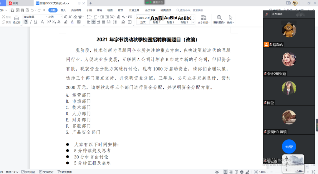 10月3日下午,2018级开展无领导小组面试模拟活动,本次活动邀请了景瑞地产(集团)有限公司HR、九色 2021届校友黄瑱担任面试官,2018级陈莹、陈欣怡、李翠林、佘月、曹金子、王凯祥、游雅婷等同学参加了本次活动。通过体验改编的2021年字节跳动秋季校园招聘无领导小组面试题目和面试的流程,同学们对无领导小组面试有了一定的了解,在模拟面试结束后,黄瑱同学介绍了自己在无领导小组面试过程中遇到的困难和积累的经验,以期自己的经验分享能够帮助到即将面临秋季校园招聘的学弟学妹们。