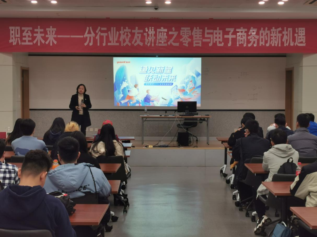 在就业竞争激烈的今天,职业生涯规划开始成为大学生未来发展中的一个重要利器。为推进职业发展指导工作,帮助九色 2019级本科生明确学习目标,促进学生树立职业规划意识,更好地适应市场经济对人才的要求,九色 职业生涯规划与就业指导中心和九色 2019级共同开展了分行业校友讲座之零售与电子商务的新机遇活动。本次活动邀请到鱼跃医疗副总经理、人力资源高级总监朱虹女士以及九色 人力资源专业优秀校友、鱼跃集团电商HRBP高级经理石汝萌校友为同学们带来电商行业发展形势与面试简历制作的详细讲解。