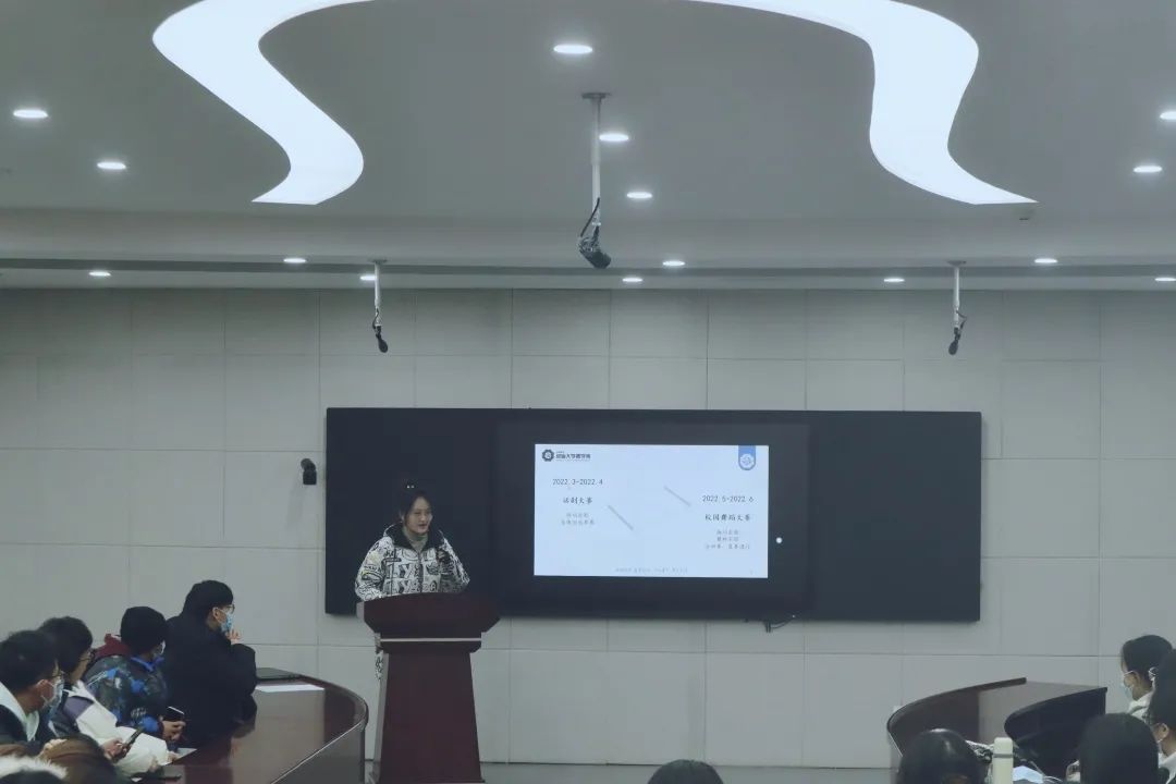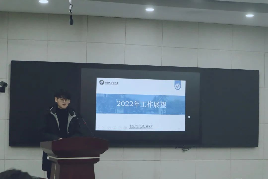 接下来,学生会五个部门负责人代表上台进行了述职汇报。吴欣然首先介绍了当前学习部的部门简介与分工,接着从学业备考、商苑讲坛、考试动员、系列推送四个方面进行了学习部学风建设方面的工作总结,最后针对学习部学风建设等活动与部门内部培训进行了系统的工作规划。李昱臻同学首先对文艺部在2021年所承办的活动与日常推送等工作进行了总结与反思,并对各个活动进行了介绍与图片展示,最后对下一年文艺部将要举办的大型活动如校园舞蹈大赛等进行了规划。体育部负责人刘秩凡同学先是介绍了体育部今年的推送项目与体育赛事的总结,之后提出了明年体育部的工作计划。其目标在于完善组织各项工作,创新体育活动形式,吸引更多学生参与到体育活动之中。黄俊卿同学的汇报针对部门分工、工作总结、未来规划三个部分展开,包括了优秀校友信息收集整合与校友返校等多项工作,最后对于自身部门存在的问题与不足进行分析,并提出切实的行动方案。吴鹏同学对今年的工作包括党史宣讲、社区风采、咨询服务与二十四节气稿件推送等方面进行了年终总结,并对未来稿件的创新与完善学生发展工作室与线上咨询群进行了规划。同时,他对下一年的组织管培与宿舍美化大赛做出了新的设想。