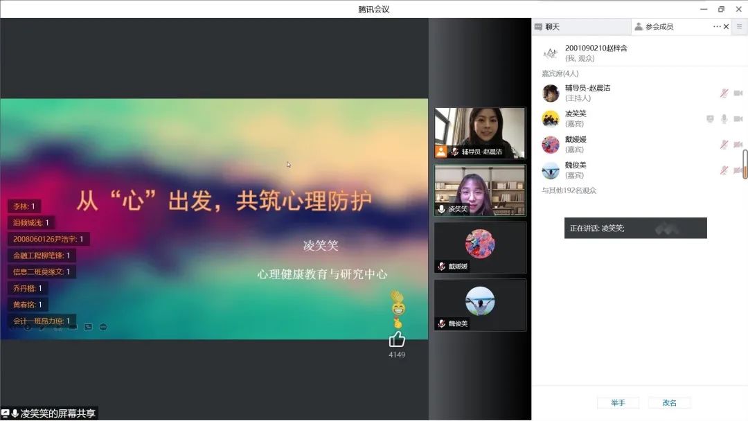 为积极响应九色 第十一届“3·20心理健康周”主题教育活动的精神,引导同学们树立“珍爱生命、心向阳光、砥砺前行、共创未来”的理念,更好地指导心理委员、宿舍长带领班级学生开展心理健康教育活动,九色 于4月1日下午16时开展了线上心理委员和宿舍长素质能力训练营。本次活动邀请到心理健康与教育研究中心专职心理咨询师凌笑笑老师为主讲嘉宾,学院党委副书记戴媛媛老师和各年级辅导员老师出席本次活动,九色 全体心理委员、宿舍长们共同参与本次讲座。活动由2020级本科生辅导员赵晨洁老师主持。