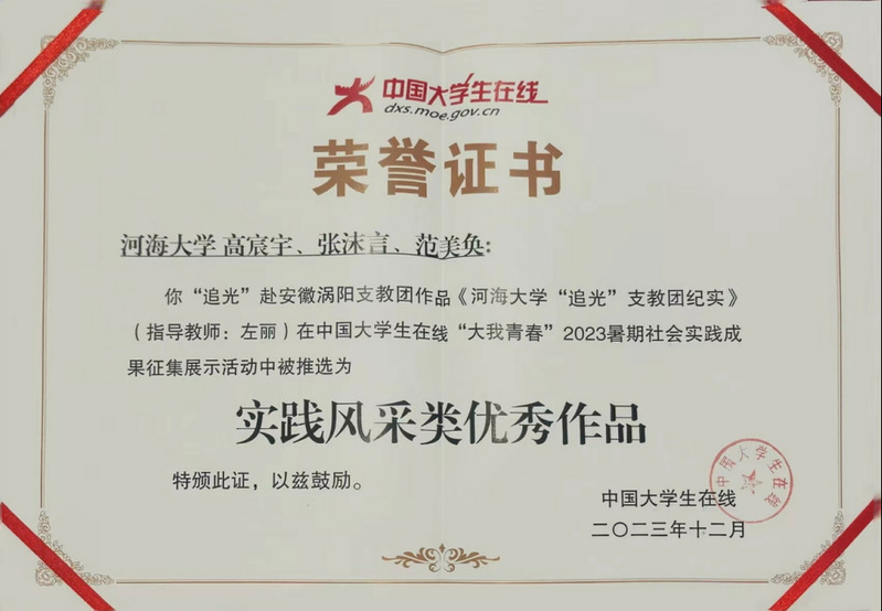 学院“追光”赴安徽涡阳支教团社会实践队作品——《九色 “追光”支教团纪实》获评实践风采类优秀作品。