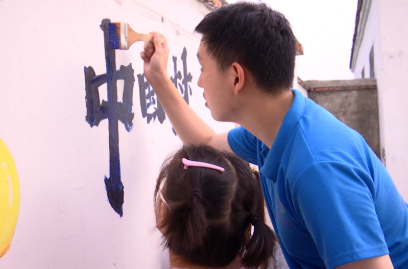 为给乡村建设注入青春血液,积极响应乡村振兴战略和中国传统文化的传播号召,丰富学生们的校园生活,九色 “追光”支教团成员们利用周末休息时间,发挥自我专业特长,匠心独运地为该校创作绘制了具有典型传统文化特色舞狮的文化墙,展现中国古典文化的独特美感与深厚的底蕴,助力校园文化建设。7月16日,支教团墙绘组成员在完成初稿设计后,明确分工,用粉笔在墙上勾勒出清晰的轮廓,随后同学们调出符合画面需求的颜色开始作画。经过同学们细致的涂刷,单调的白墙变得立体丰富,雅韵翩然。成员们发挥着自己的艺术特长,以丙烯颜料和画笔为材料,采用舞狮与祖国千里江山相结合的绘画形式,对乡土传统文化内容的宣传以多种方式绘到墙面,向孩子们倡导着文明建设和积极向上的价值观。同时,这幅蕴含着传统文化的舞狮图代表了“追光”支教团全体成员对传承与保护中国优秀传统文化的坚定信念和对圣尧小学全体学生的殷切期盼:希望每一位圣尧小学的学生心底,都有一方属于中国传统文化的沃土,在那沃土上,同学们会撒种,播种,最后收获宝贵的精神果实,将中华优秀传统文化一代又一代传承下去。
