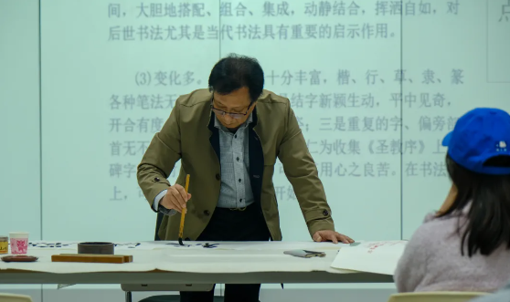 赵老师谈及自身临摹的体会:临帖是一个漫长的过程,艰辛枯燥,需要持之以恒。在临帖的“帖”的选择上,要找到“好的老师”,真正临摹好的帖,才能真正得到提升。书法光是临摹是不够的,还要学会创新。“创”体现在两个方面,一是某个字采取不同书法大家的笔法;二是在字与字的衔接上字体的选用。临帖足够多,基础足够好,可以达到无意识创作的境界。讲座中赵老师多次强调,书法是中国传统文化浓墨重彩的一笔,应传承下去。