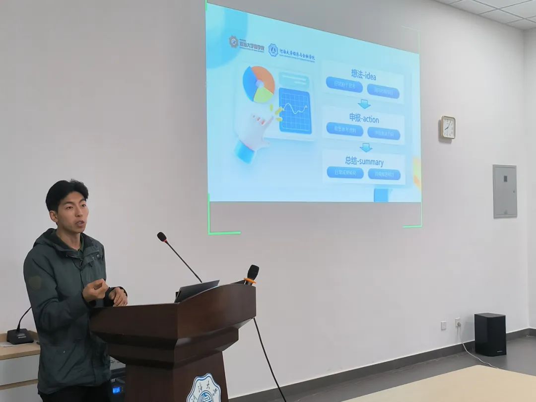 林欣雨同学从时间分配和人员配置等方面介绍了项目团队管理和项目成员分工的经验,并通过现场演示,展示了数据收集与期刊检索的具体流程,为同学们实施好大创计划提出了建议。