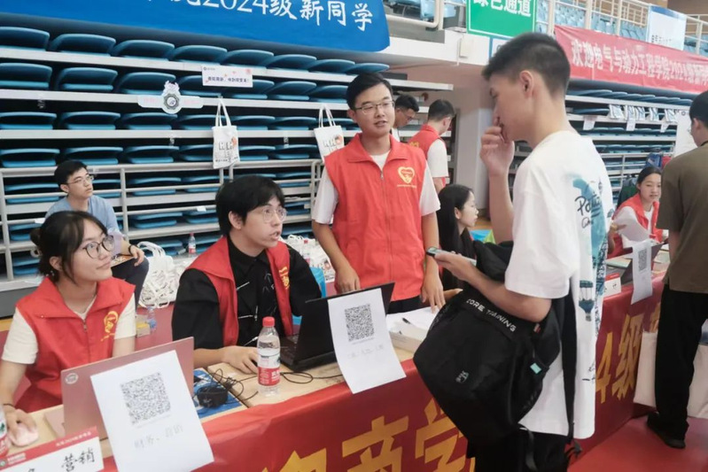 穿着红色马甲的商院志愿者们穿梭在校园为新生服务,在新生报到注册点,志愿者们核验身份、信息登记、发放礼包;在宿舍楼下,志愿者们发放物资、引导路线、搬运行李,他们以饱满的热情、细致的服务向新生们传递关怀与美好。