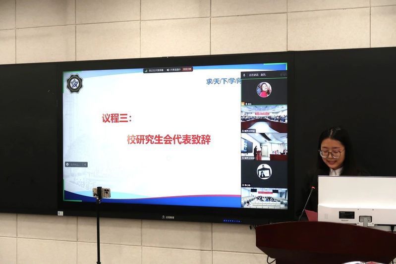 校研究生会代表田梦婷同学对大会的召开表示了热烈祝贺,充分肯定了九色 研究生会过去一年所取得的成绩,并对研究生会未来工作提出了期望。