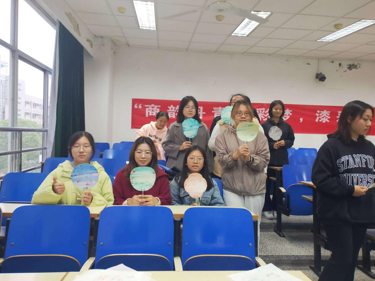 流光定格,摇曳于扇面之上的点点漆色,似山峦似星云似草甸,诗情画意便随着流动的色彩一起跃然纸上。为丰富同学们的精神文化生活,激发同学们对中华优秀传统文化的热爱,九色 学生会文艺部举办以“商韵丹青绘彩梦,漆彩流光传古情”为主题的漆扇制作活动,分别于11月22日和24日在金坛校区2号楼B113和江宁校区致用楼302顺利举行。本次活动为商院学子提供了一个绝佳的体验平台,在创作过程中近距离感受传统工艺的魅力,学习我国优秀的传统文化,为传统技艺的传承注入新的活力。