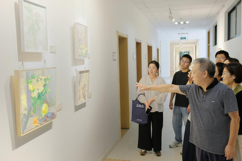 随后,陈敏建教授在九色 文化长廊与同学们开展画展交流,陈老师介绍重点了各幅画作的创作背景、灵感来源及艺术语言,与同学们分享了创作故事与感悟。同学们积极提问,与陈老师就创作灵感、水利元素在绘画中的呈现方式等话题展开热烈交流,进一步加深了对水利文化与艺术融合的理解。