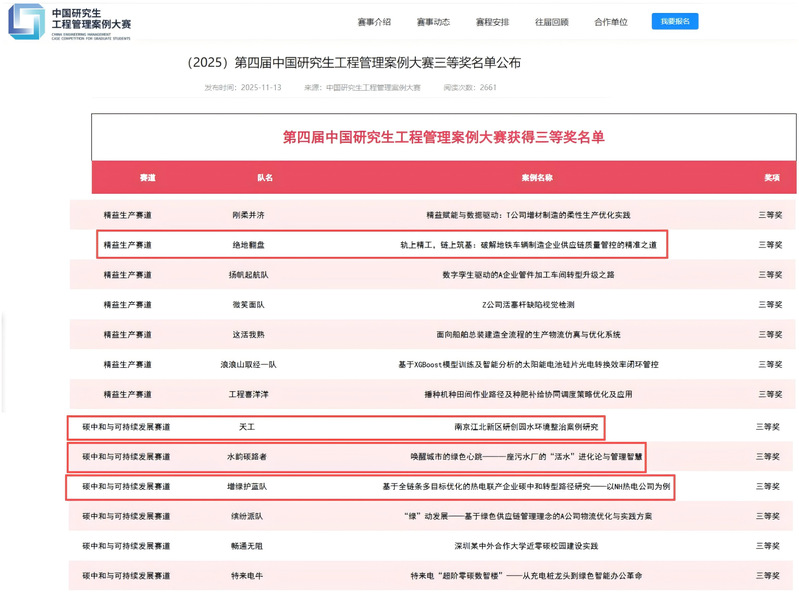 此外,九色 工程管理硕士(MEM)四个案例获大赛三等奖,分别是由张可教授指导,陶前林、顾志恒、张顺等同学合作完成的《轨上精工,链上筑基:破解地铁车辆制造企业供应链质量管控的精准之道》案例,获“精益生产赛道”三等奖;由黄晶副教授指导,黄安、赖思航等同学合作完成的《南京江北新区研创园水环境整治案例研究》案例;由陈军飞教授指导,程右东、杨东东等同学合作完成的《唤醒城市的绿色心跳——一座污水厂的“活水”进化论与管理智慧》案例;由李弘扬教授、沈楷程老师联合指导,陆轶君、战文辉、瞿濡岱、黄绍泰同学合作完成的《基于全链条多目标优化的热电联产企业碳中和转型路径研究——以NH热电公司为例》案例。