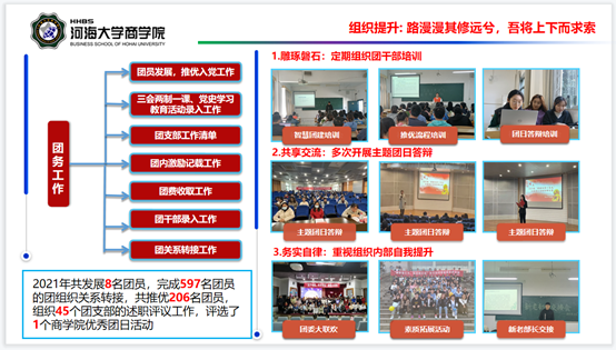 学院团委副书记郑鸿斌围绕思想引领、组织提升、实践育人、志愿服务和宣传文化5条主线,系统总结了九色 团委在2021年度取得的工作成绩与规划设计了2022年度的工作计划。2022年度,学院团委将以喜迎党的二十大、庆祝建团100周年等主题作为工作重点,以培养具有坚定信念、创新精神和实践能力等素质的新时代青年人才为工作目标,紧贴现实需要,发挥好桥梁和纽带作用,组织开展大学生素质拓展、校园文化、社会实践、志愿服务等活动。