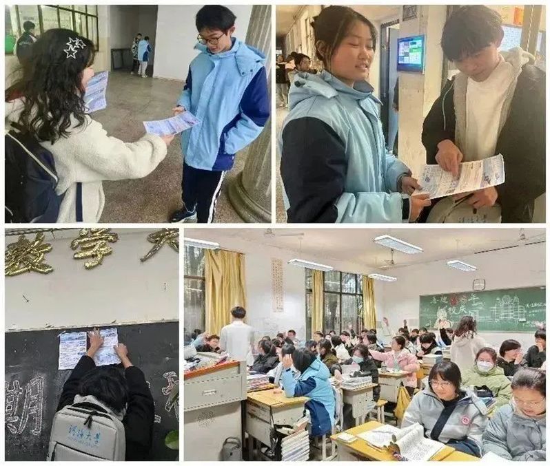 在发放材料的过程中团队成员也积极地为同学们答疑解惑。他们以生动的语言和鲜活的经历,分享了在大学期间学习和生活中的收获与感悟。此外,他们结合自身经历和个人专业学习感悟,围绕着如何选择专业、如何拓展兴趣爱好、如何处理人际关系等方面,向高中学弟学妹们传递了宝贵的经验和建议。此次宣讲活动不仅拓宽了高三学生的视野,深化了他们对专业选择等方面的认知,更激发了他们的学习热情和进取精神。