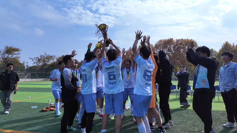 从小组赛、到四分之一决赛,再到半决赛,学院足球队敢打敢拼,昂首挺进决赛。决赛对阵水电院,比赛伊始,双方就展开了激烈的“战斗”,上半场双方均未进球。高潮出现在下半场第40分钟,对方给6号秦国诚留下一对一的机会,秦国诚凭借快速的脚下频率,迅速过人后稳稳将球送入球门,九色 取得1-0的领先。在一声声助威和欢呼中,球队没有失去应有的节奏,继续稳守防守反击的阵型,注意力高度集中,坚持每球必争。门将22号乃吾夏提状态神勇,多次高接低挡,将对方一次次极富威胁的射门拒之门外。后卫线也齐心协力,果断解围、耐心传导。随着对方最后一次进攻无果,主裁判一声哨响,比赛落下帷幕,九色 是冠军!一个多月以来的拼搏与坚持,在此刻的阳光下显得弥足珍贵。在这个暖秋,九色 开启了一段精彩纷呈的足球旅程,用一场场热血沸腾的胜利,以及创造历史的首座冠军,书写了一段难忘的回忆,赋予无法割舍的足球情缘。