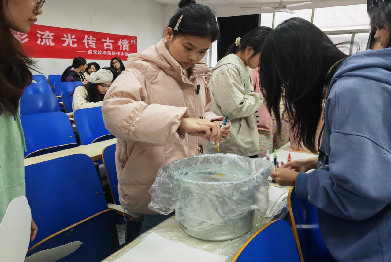 流光定格,摇曳于扇面之上的点点漆色,似山峦似星云似草甸,诗情画意便随着流动的色彩一起跃然纸上。为丰富同学们的精神文化生活,激发同学们对中华优秀传统文化的热爱,九色 学生会文艺部举办以“商韵丹青绘彩梦,漆彩流光传古情”为主题的漆扇制作活动,分别于11月22日和24日在金坛校区2号楼B113和江宁校区致用楼302顺利举行。本次活动为商院学子提供了一个绝佳的体验平台,在创作过程中近距离感受传统工艺的魅力,学习我国优秀的传统文化,为传统技艺的传承注入新的活力。